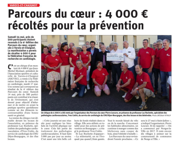 4ème édition du parcours du coeur Rédacteur web Catégorie : Actualités 22 Mai 2022 Clics : 3314Une belle journée et un beau résultat ! Merci à tous les participants !500 participants à Varois et Chaignot;4000€ récoltés pour la prévention! SecretariatSuivant Aucun commentaire